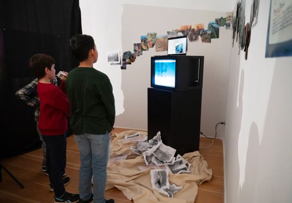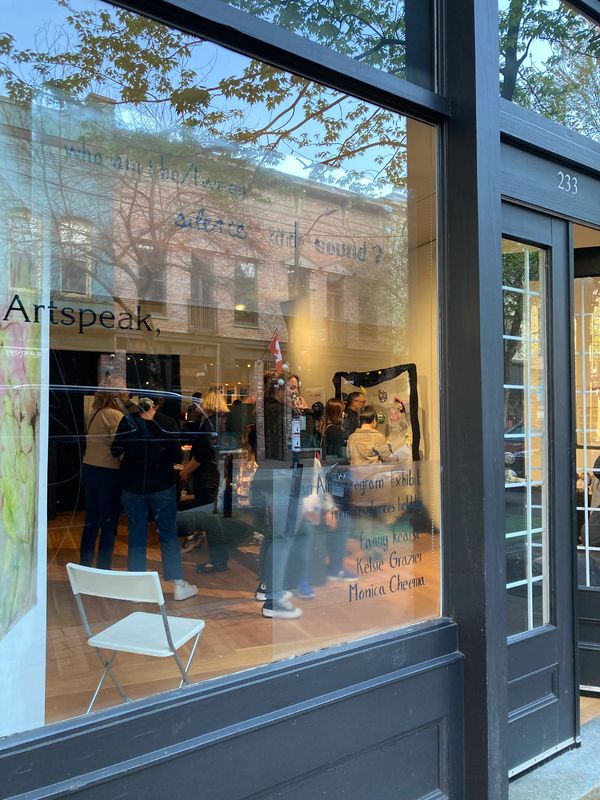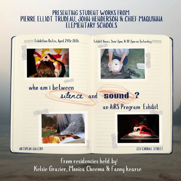 AIRS program hosted a 3 day pop up exhibition at ARTspeak Gallery, a public gallery in downtown Vancouver from April 23-26, 2025 featuring masks, poetry, abstract works, collage animations and soundscapes created by intermediate students at Pierre Elliot Trudeau, John Henderson and Chief Maquinna Elementary. Led by artists Kelsie Grazier, Monica Cheema and fanny Kearse, students worked with diverse media (sound, light, colour, shadow, gesture, words, archival photography, and found ephemera) to explore the space where image and language intersect This is the spaces between silence and sound, seeing and speaking, where intimations and expressions of our authentic self and our being in the world can emerge. The opening was an inspiring celebration for students and their parents, featuring student poetry performances and a panel of student artists. This powerful exhibition, opened up space for intergenerational exchange where young people model the practice of being true to ourselves, and vulnerable to the possibilities of our creative transformation through art.
